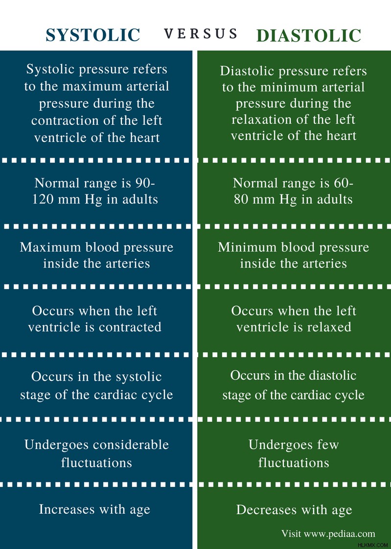 動脈の血圧には、収縮期と拡張期の 2 種類があります。心臓は、体の主要な動脈である大動脈に血液を送り出します。動脈のネットワークは、圧力下で全身に血液を輸送します。収縮期血圧は、動脈内で最も高い圧力です。拡張期血圧は、動脈内の最小の圧力です。収縮期と拡張期の主な違いは、収縮期は拍動中に心臓によって生成される圧力であるのに対し、拡張期圧は拍動の間に発生することです。 通常の収縮期および拡張期圧は 120/80 mm Hg です。収縮期血圧と拡張期血圧の数値差は、脈圧と呼ばれます。正常な脈圧は 40 mm Hg です。