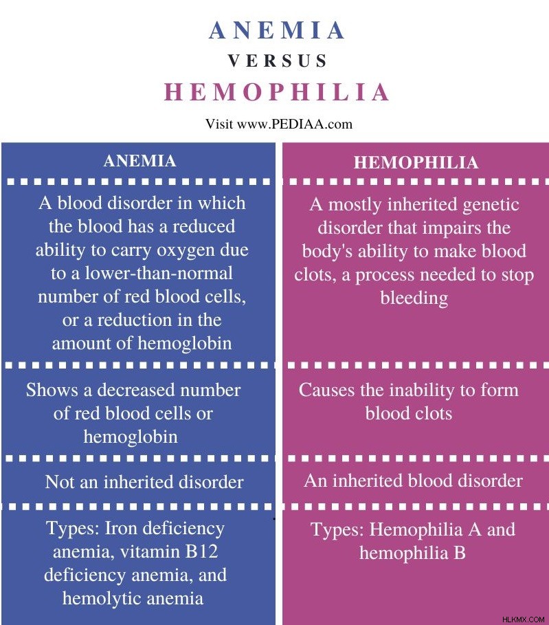 貧血と血友病の主な違い 貧血は、赤血球またはヘモグロビンの減少により血液が酸素を運ぶ能力が低下する血液疾患であるのに対し、血友病は主に、体の血栓形成能力に悪影響を与える遺伝性疾患です.